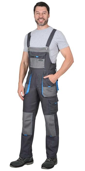 Полукомбинезон из ткани "Панакота Комфорт" с застежкой гульфика на молнию, застежкой в боковом шве на пуговицы, накладным объемным комбинированным карманом на нагруднике с фигурным клапаном, застегивающимся на липучку. Изделие с нижними боковыми накладными комбинированными объемными карманами с наклонным входом, с накладным объемным карманом и фигурным клапаном на правом боковом шве, застегивающимся на липучку, с объемными наколенниками, с задними накладными объемными карманами и комбинированным карманом для инструмента. В области талии по всей ширине с изнаночной стороны вставлена резинка для лучшего прилегания.